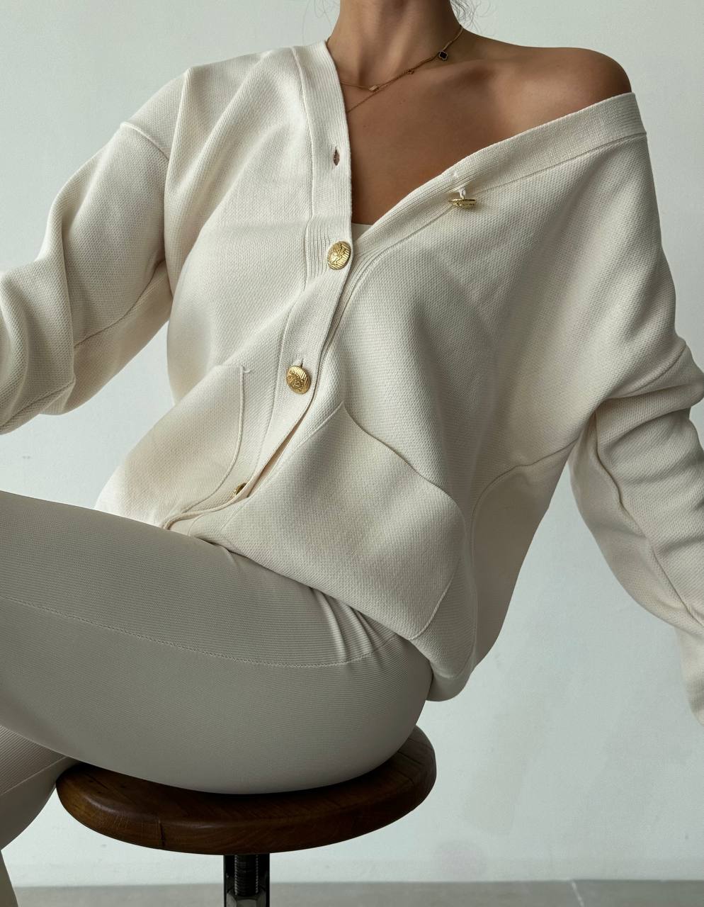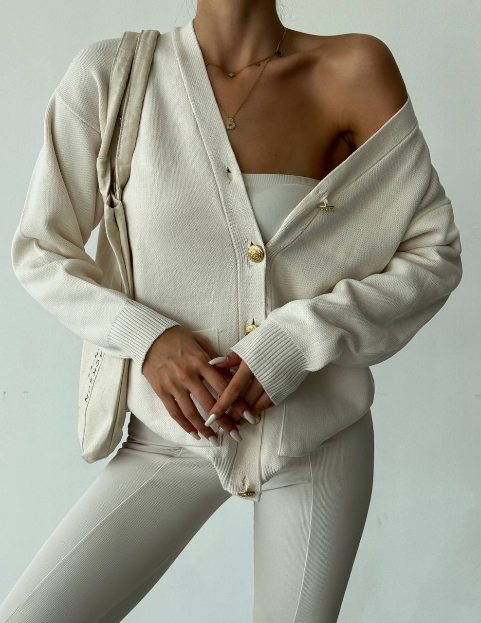 Un gilet beige tendance avec ouverture devant par des boutons dorés. Deux poches.