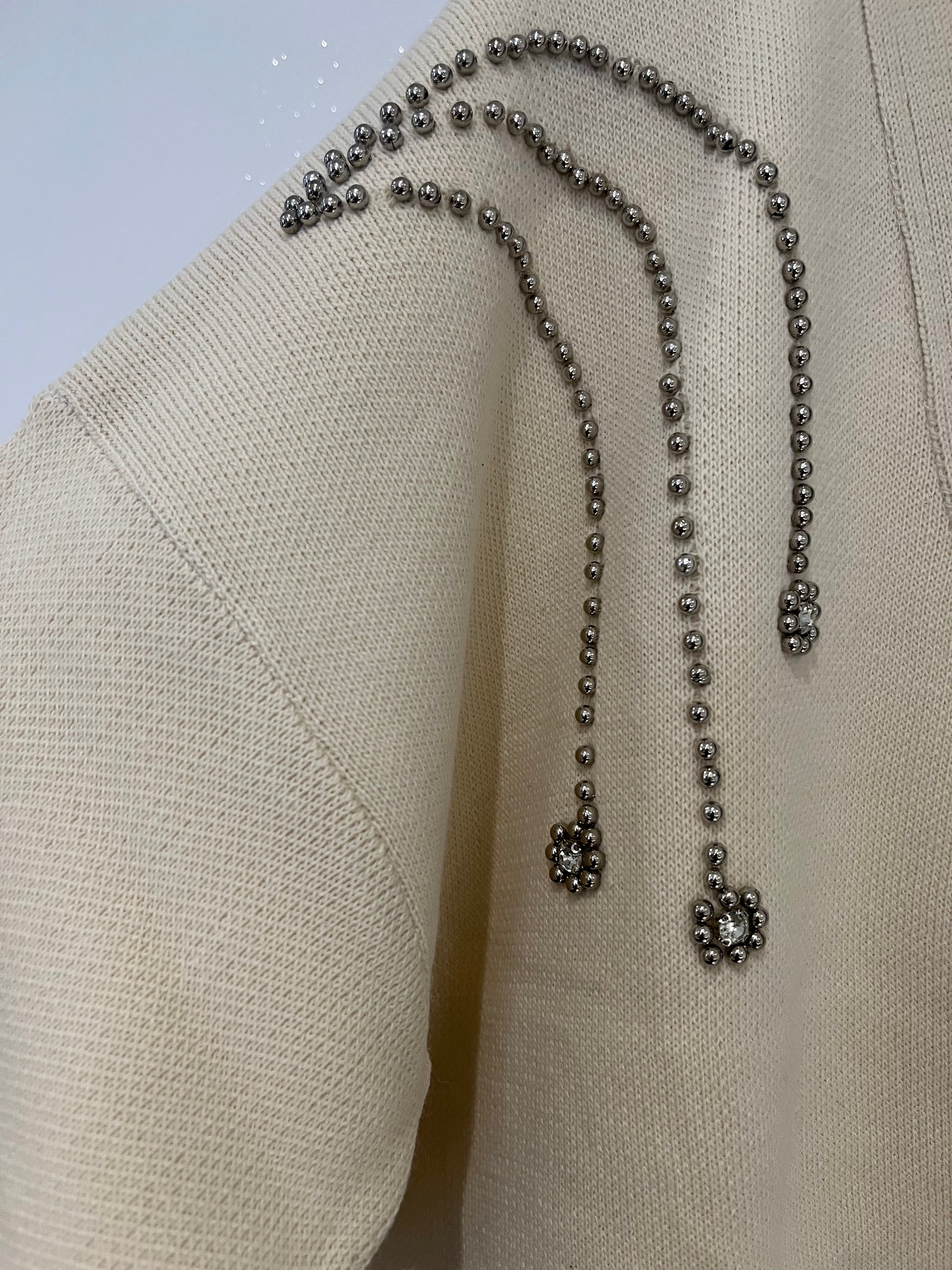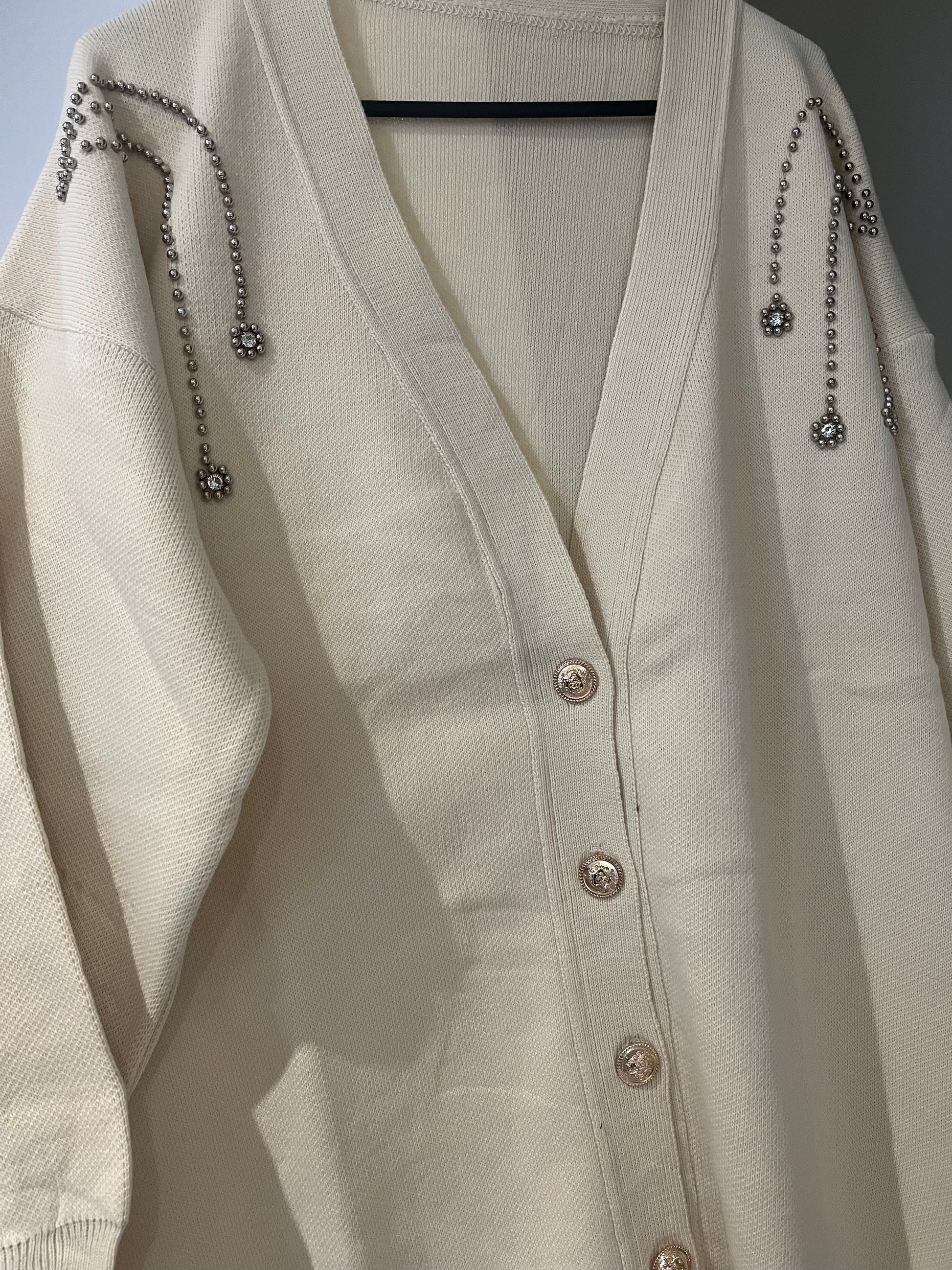 Gilet long oversize beige avec détails en perles aux épaules et boutons.