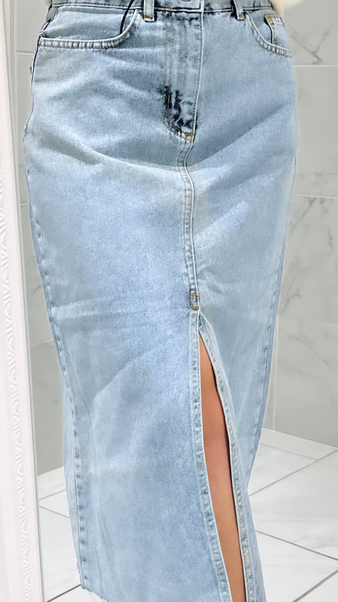 Jupe en jean avec ourlet fendu. Très tendance et plus belle en vrai.