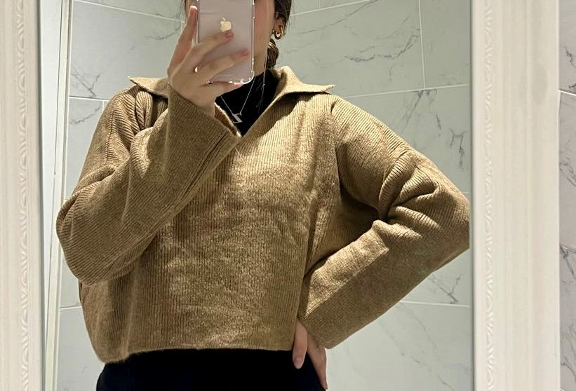 Superbe pull marron court à manches longues chauves-souris et large encolure à revers. Une coupe ample et confortable.