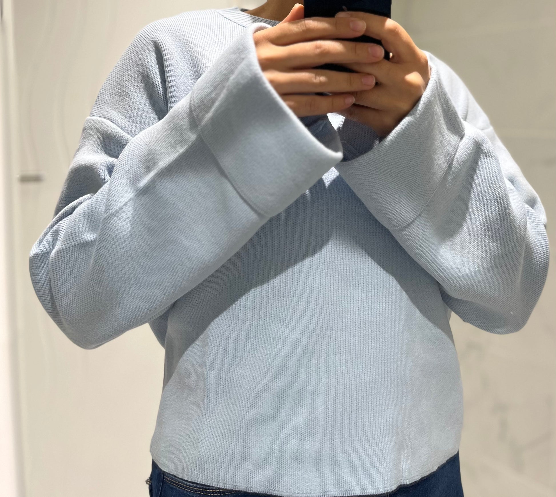 Un pull uni bleu à manches chauve-souris et retroussée et col rond pour un look renversant tout en finesse.